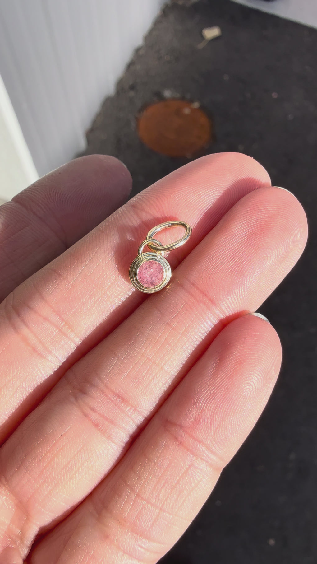 This charm features a 4mm Moyo Pink Sapphire from one of our fair trade suppliers. This Sapphire is natural (untreated) and bezel set into the charm.