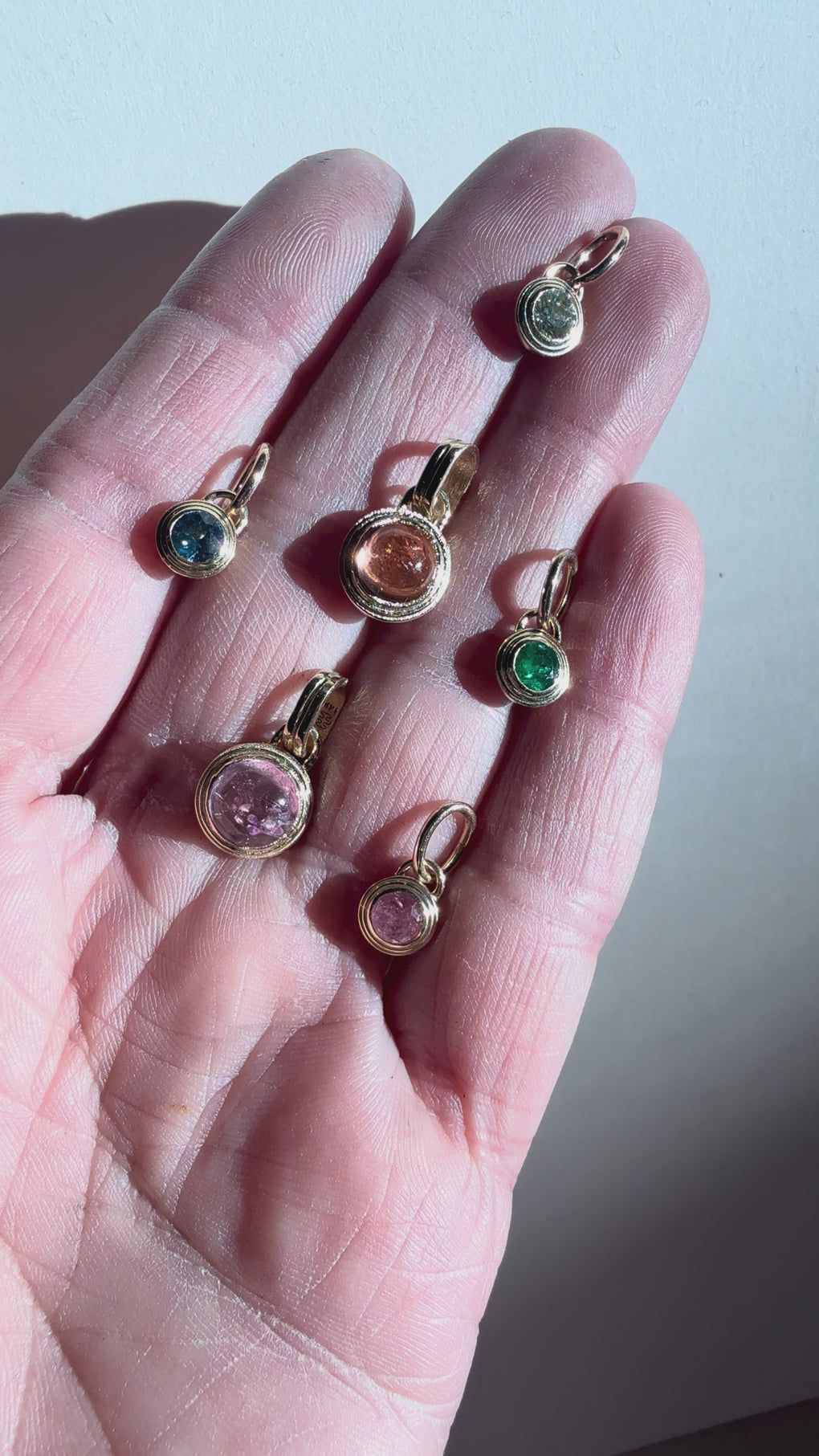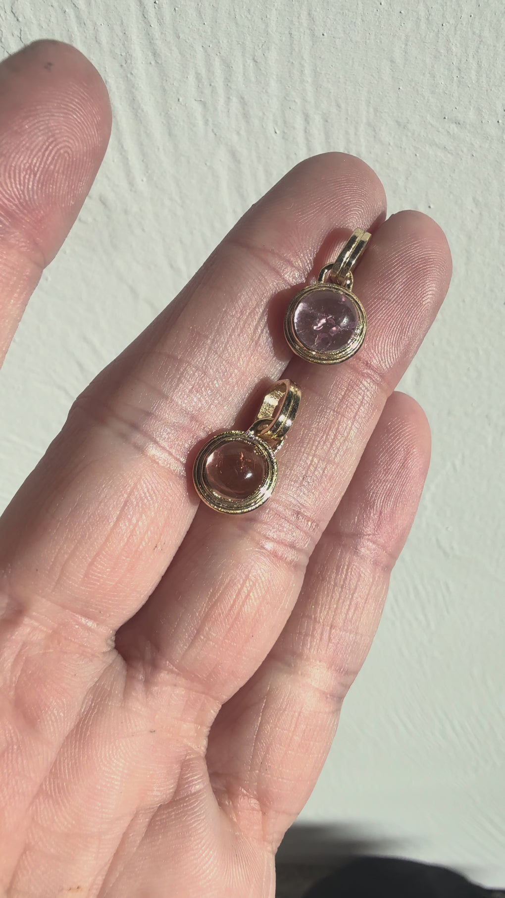 This charm features a 6.9mm Pinkish Purple Imperial Topaz Cab from a now closed mine in Brazil. This Topaz is natural (untreated) and bezel set into the charm.
